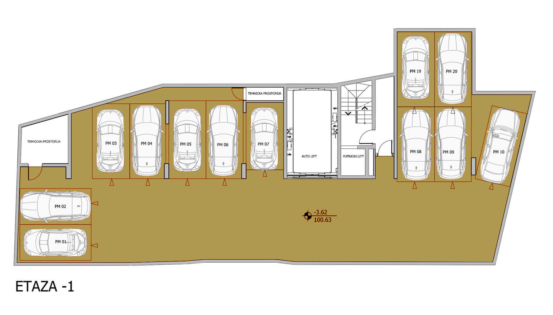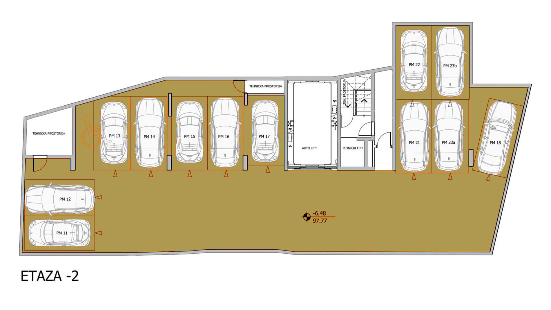 Za parkiranje vozila predviđene su dve podzemne etaže – garaže sa ukupno 23 parking mesta. Pristup garaži predviđen je auto liftom sa pristupom iz Ulice Generala Lešljanina. Garaža je potpuno protivpožarno opremljena sprinkler sistemom, detektorima ugljen monoksida, sistemom za ventilaciju i odimljavanje kao i sistemima za dojavu.